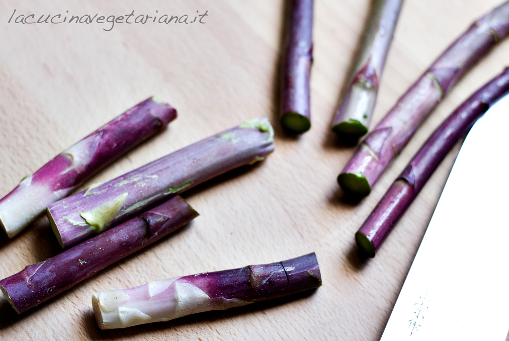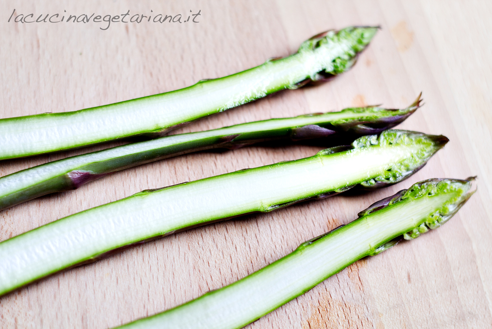 Mondate per bene gli asparagi sott’acqua pulendoli dalla sabbia e tagliate via la parte terminale del gambo più dura.