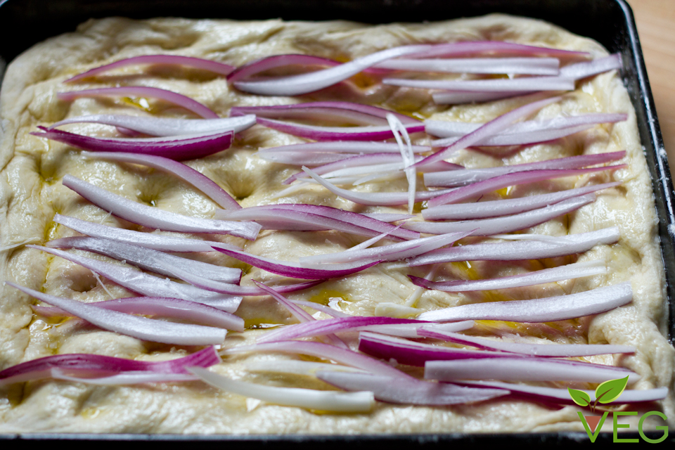 Tagliate la cipolla di tropea a fette e distribuitela sulla focaccia condendo con un po’ di sale grosso integrale. Lasciate riposare per 30min in modo che riprenda a lievitare quindi infornatela a 260° per 30min.