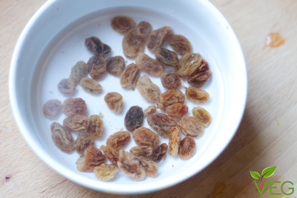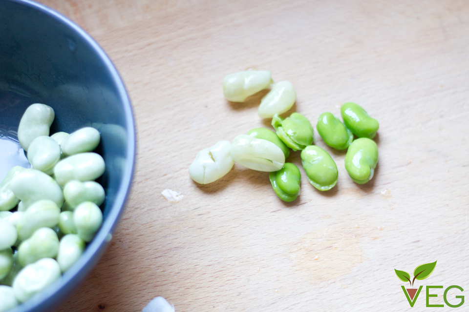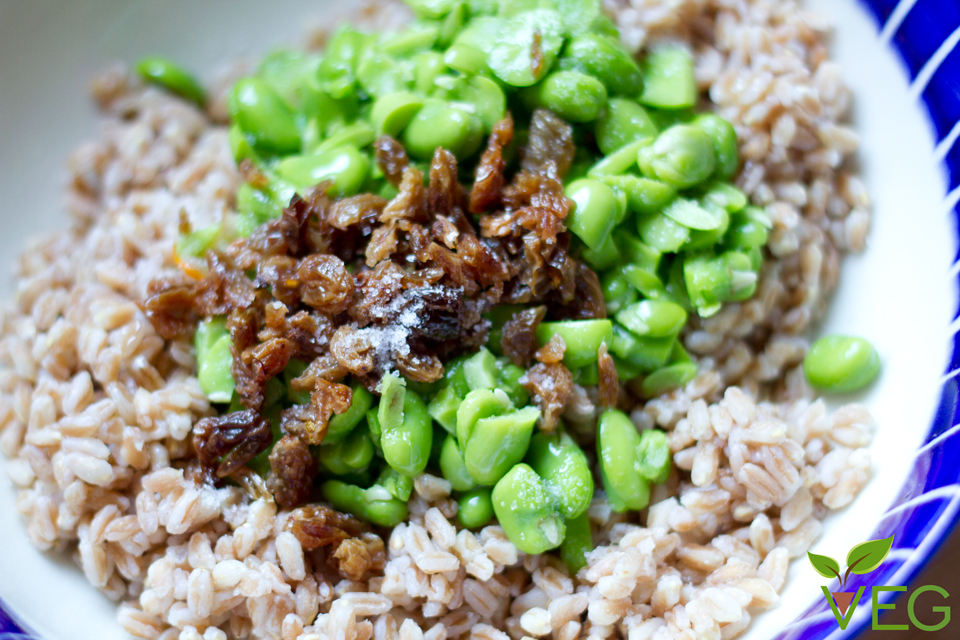 Condite il farro con l’uvetta ammollata e le fave, sale e olio.