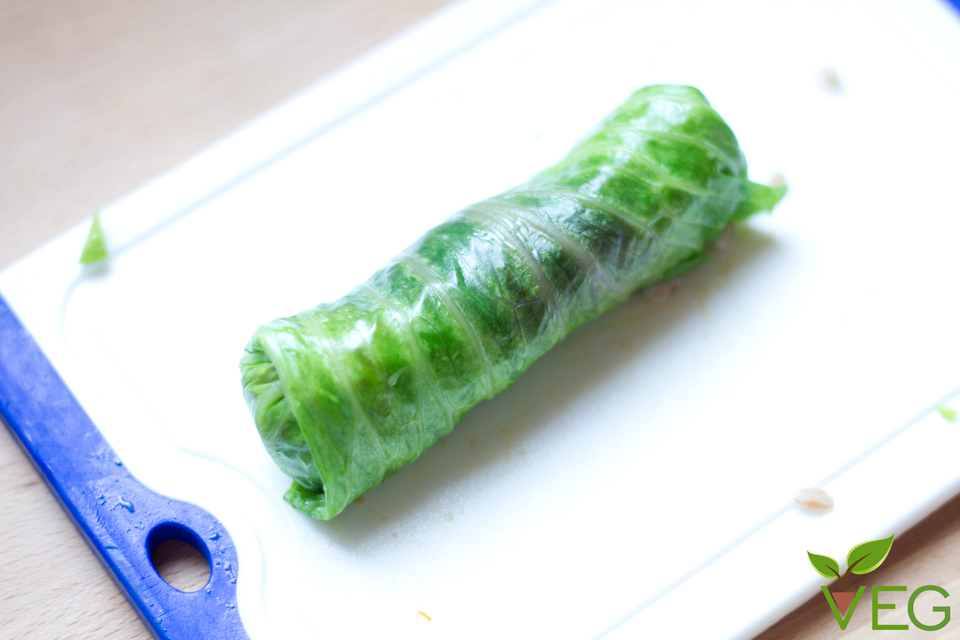 Mettete un cucchiaio di ripieno nella metà bassa di ogni foglia di verza, piegate su se stessa la foglia in modo da coprire il ripieno, ripiegate i lati destro e sinistro verso il centro e arrotolate dal basso verso l’alto.