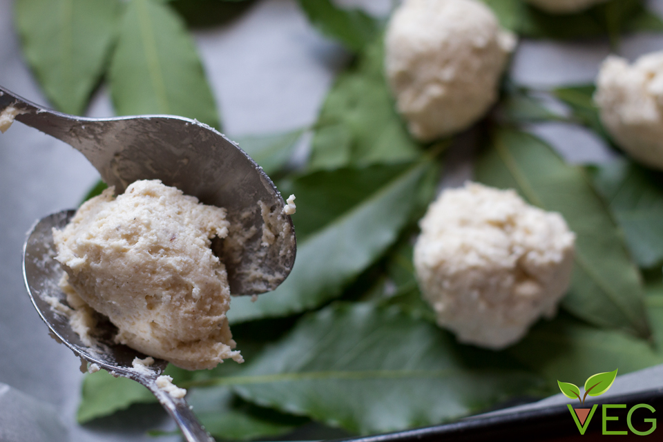 Date forma a delle palline usando due cucchiai e appoggiatele sopra le foglie d’alloro. Mettete in forno a 240°C per 25 minuti.