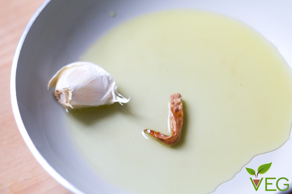 Fate soffriggere in padella l’aglio in camicia e il peperoncino.