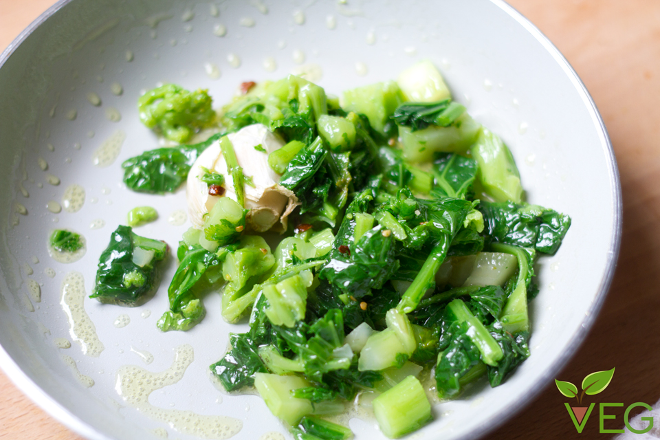 Fate saltare le cime di rapa e le foglie in padella con l’aglio e il peperoncino per 2 min.