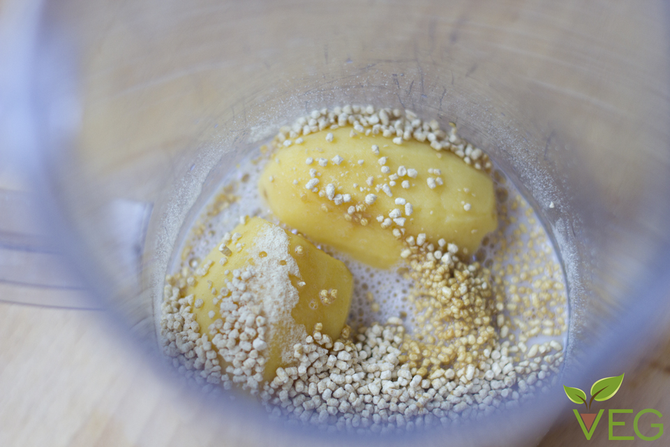 Frullate con un minipimer le patate crude e sbucciate con il latte di soia e la lecitina fino ad ottenere un composto denso simile alle uova sbattute.