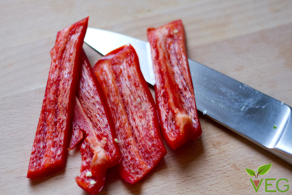 Mondate, vuotate dai semi e tagliate il peperone a fette per la lunghezza.