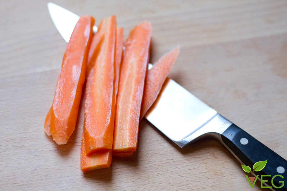 Spelate la carota e tagliatela a fette sottili per lungo.